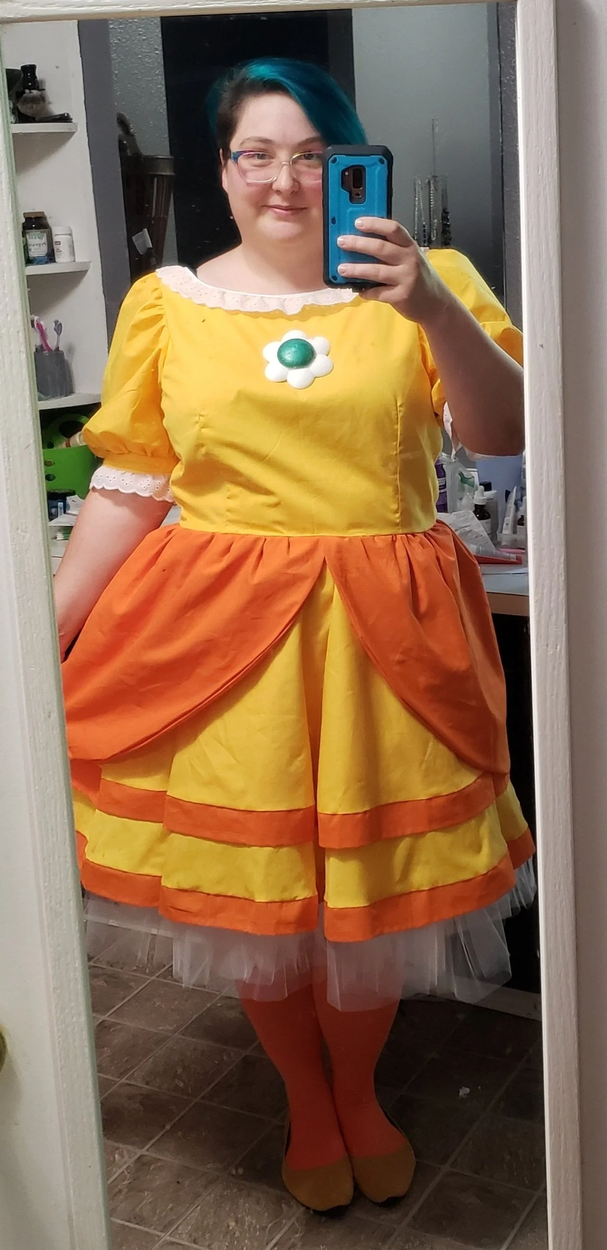 I looked at a lot of other cosplayers who did Daisy trying to decide how I wanted to do her cosplay. I wanted a big, poofy princess dress, but it didn't seem realistic. I was on a minimal budget, we were traveling by train so I didn't want to carry a lot of baggage for lots skirts. And I hadn't really been to a large convention for a whole day (I spent a couple hours at Rose City Comicon in 2018) and managing a massive ballgown seemed like a pain. So in the end I decided making a short version of her dress would probably be easiest.